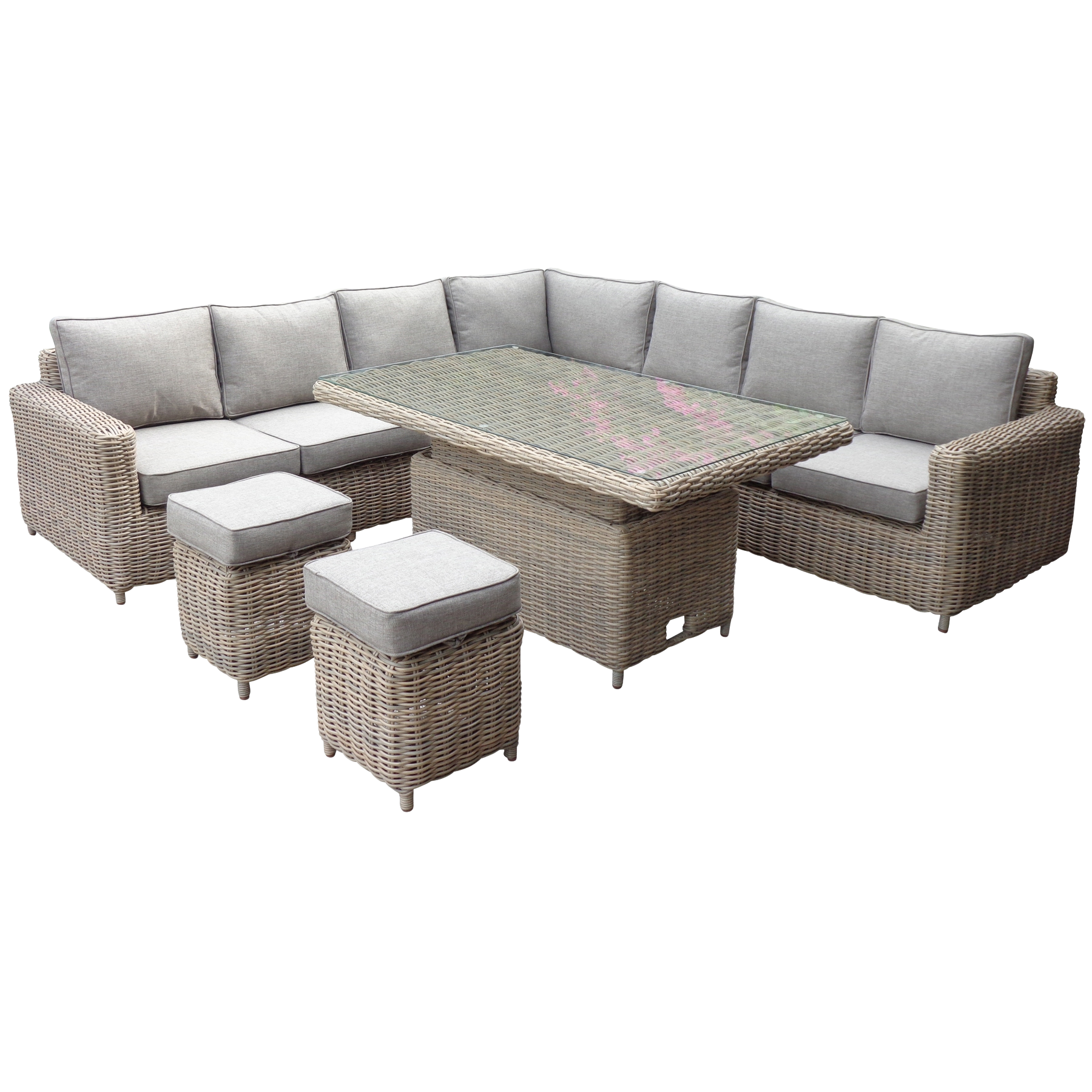 Adjustable riser table transforms from coffee to dining height in this luxurious Amalfi corner set. Weather-resistant materials and modular design create the ultimate outdoor living space with unmatched style.